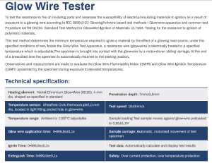 the Glow Wire Test Apparatus, a resistance wire (glow-wire) is electrically heated to a specified temperature which is adjustable.The specimen is brought into contact with the glow-wire by a motor-driven sliding carriage. At the end of a prescribed